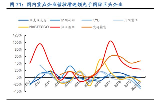 国内重点企业进入快速扩张期。2016年以来,国内龙头企业恒力液压、爱迪精密营收规模快速增长。2017年,恒力液压营收增长翻倍,爱迪精密营收增速也达到60%,近三年保持了较高的稳定增长。2020年上半年,恒力液压和爱迪精米的营收增速分别达到23.8%和47.3%。