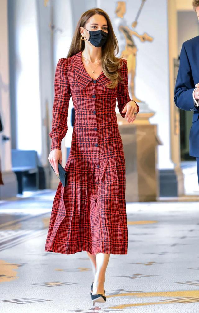 英国凯特王妃也是千鸟格图案的爱好者。千鸟图案是皇室出席活动必不可少的时尚元素之一。这件黑色千鸟格图案的红色连衣裙,雍容华贵,很符合皇家气质。