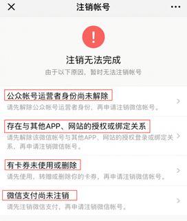 好在注销微信账号的限制很多,需要满足四个条件:1。该帐户处于安全状态;2.微信支付财产要结算;3.卡券需要清零空,需要联系相关微信平台权限;4。其他绑定的app和网站的账号要注销。