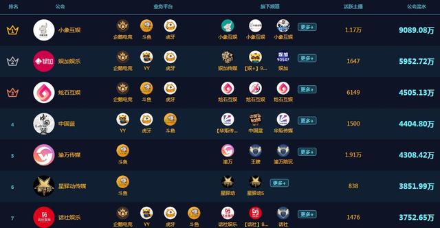 今天,边肖带你看看本月公会后台收入排行榜前10名。据不完全统计,截至6月1日0:00-6月1日24: 00,目前6月冠军为大象互娱协会,其本月后台收入为9085.56万元。其公会分别在宇都、虎牙直播、企鹅电竞开设,活跃主播11700人,活跃主播是指每天直播30分钟以上,每月20天以上。其中,协会在宇都平台收入7361.18万,占协会总收入的80.98%,企鹅电竞协会收入584.57万,占总收入的6.43%,虎牙直播收入578.27万,占总收入的6.36%,鱼游星火协会收入269.75万。