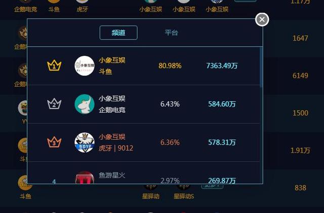 亚军为娱协收入5950.43万元。他在Laicrazy直播平台、企鹅电竞、yy直播、虎牙直播成立协会,其中收入主要来自yy直播、虎牙直播,yy直播主播收入来自其主播协会,毕加索7038协会2287.97万元,文儿951协会1849.75万元,虎牙娱乐831.15万元。第三名互娱协会收入4503.25万元,第四名中国蓝协会收入4402.67万元,包括李先生的华聚传媒等关联协会。第五名重庆万协会收入4297.02万元,第六名星艺东传媒协会3851.90万元,第七名华社娱乐协会3752.65万元,第八名无棣传媒。