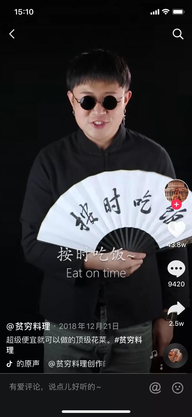 11月15日晚8点,《穷人的美食》在Tik Tok进行了首次现场直播。贫困美食是Tik Tok的主要食物来源。在他的视频中,达人经常带着一副圆形墨镜,穿着黑色夹克,手里拿着一把纸扇出现在镜头前。