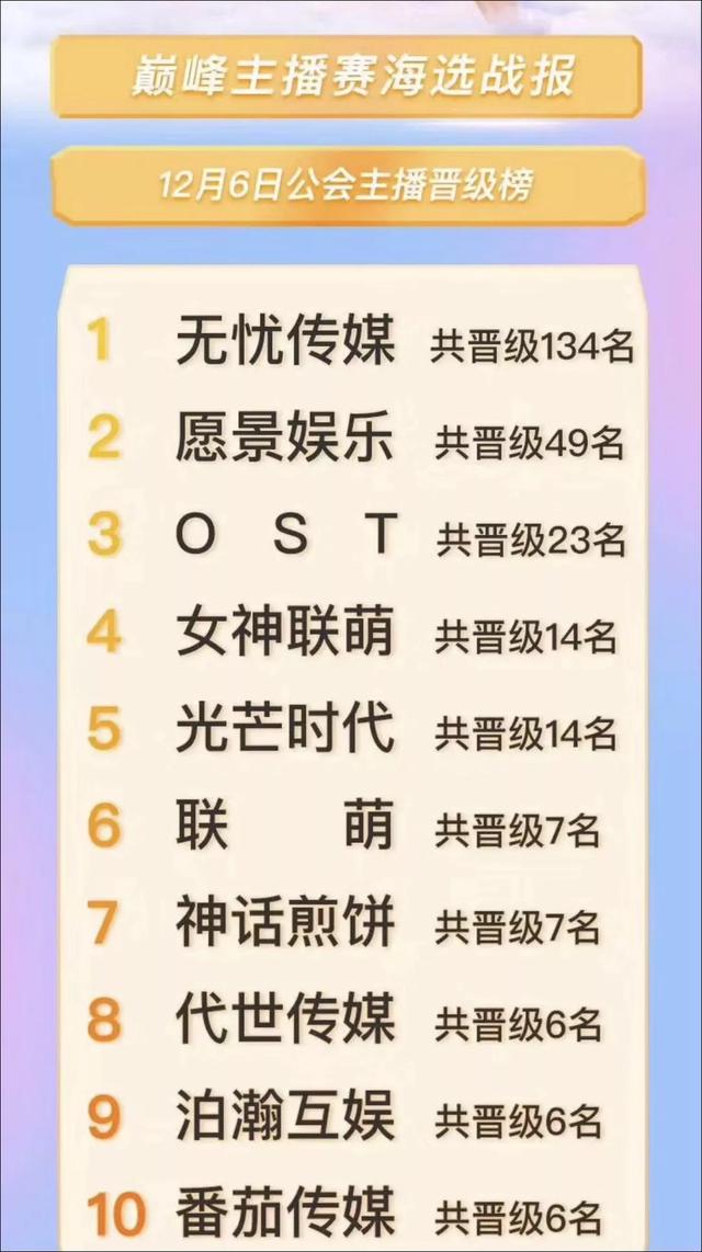 比如巅峰赛资格赛排名第一的女主播,就来自一个初创公会。
