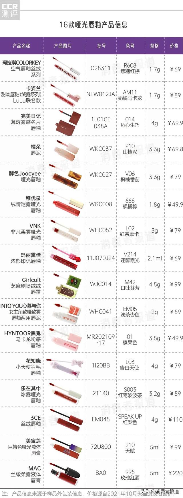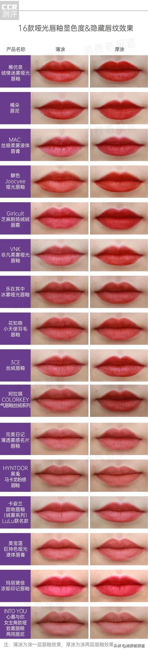 从显色性、持妆性、摸杯性、延展性、唇部皱纹隐藏效果、卸妆难易程度、干燥程度、气味等八个方面,16款唇釉中有两款是智友泉模糊哑光唇釉和Girlcult芝麻剧场模糊唇霜。