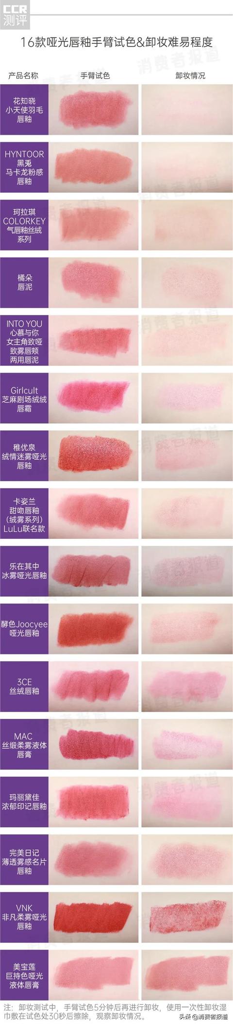 本刊将16种唇釉分别涂抹在同一个人的手背上,用同一款卸妆湿巾卸妆,根据卸妆后的残留物判断卸妆难度。