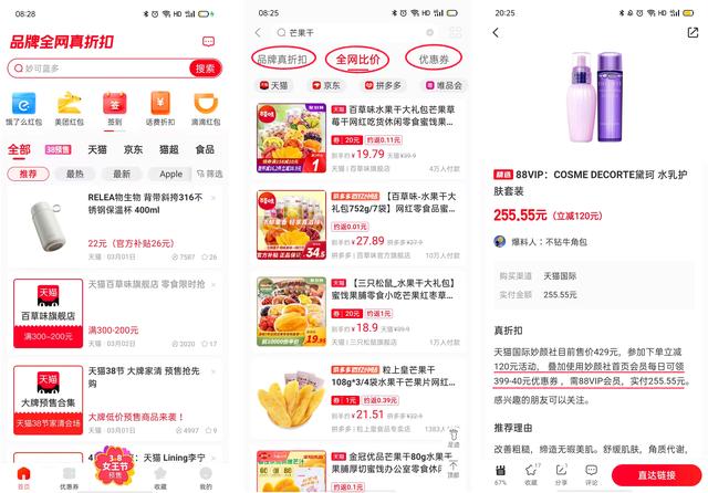 其中品牌折扣是性价比比较高的产品,也能找到很多大牌的折扣。全网比价可以让我们直观的看到各大平台同品类产品的价格,从而选择低价入手。