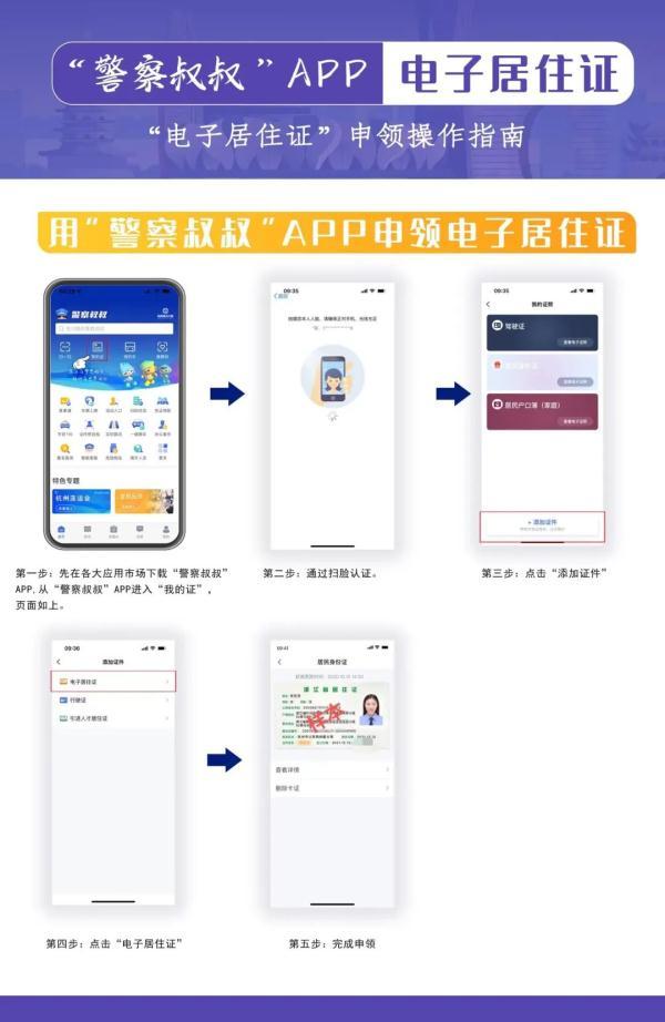 符合居住证申领条件的人员,可通过浙江政务服务网或杭州市公安局“浙江办”APP“流动人口专区”、“警察叔叔”APP在线办理电子居住证及签注。已完成居住证申领的人员可登录“李哲办公”APP或“警察叔叔”APP,完成人脸识别验证后,即可查看并显示自己的电子居住证。其中,已申领或首次申领电子居住证的,须在“我的许可”中加载电子居住证。