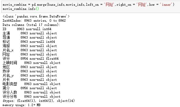 base_info表包含了我们批量抓取的电影的基本信息,而movie_info表则是我们进入每部电影时得到的感兴趣的领域的汇总。以下分析依赖于两个表,因此我们将它们合并起来: