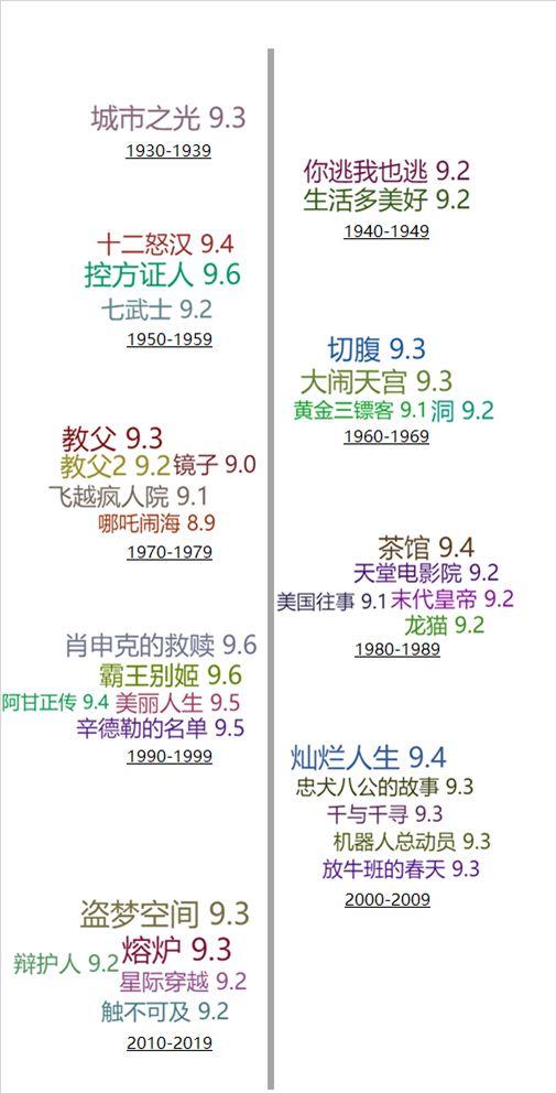在附上代码和榜单之前,我预感到大部分朋友都和我一样懒(他们不会仔细看榜单),于是我整理了不同年代的TOP5电影(其中有不到TOP5的),做了一个精英版的历史电影榜单。