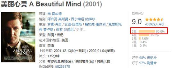 9分,美魂56.0%获得5星好评,比搏击俱乐部少4.9%,比4星数量多6%。可以不负责任地总结:两部电影都是9分经典,但观众对《搏击俱乐部》的5星倾向高于《美丽心灵》。