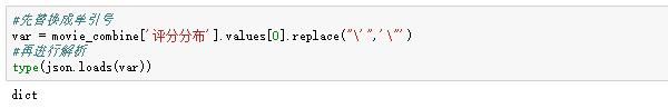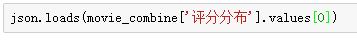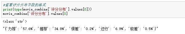 最终我们希望结合一部电影的整体评分(比如一部电影8.9分)和不同评分水平(5颗星的70%)进行分析。刚才我在抓取评分数据的时候,为了偷懒,用字典把评分等级和对应比例包了起来。但是鹅和熊猫默认把他当成字符串,不能直接当字典:
