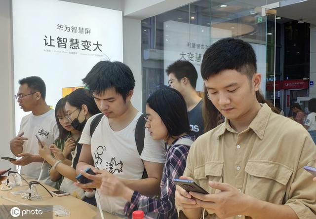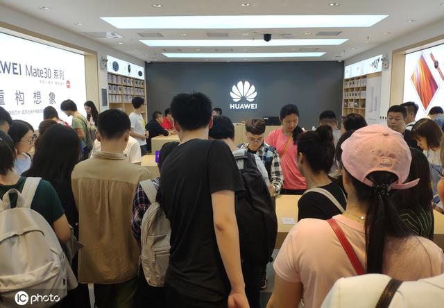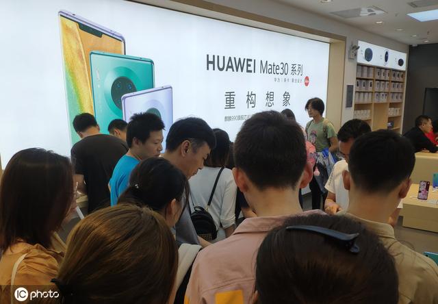 华为Mate30系列手机亮相华为实体店,客户扎堆体验新手机。(照片签名:IC照片)