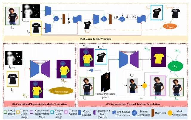 SieveNet旨在捕捉衣服和人体模型的图像,并生成穿着衣服的人体模型的新图像,同时保留原始的体形、姿势和其他细节。为了达到这个目的,它采用了多阶段技术,包括对服装进行变换,使其保持与人体模特相同的姿态和形状,然后将变形的纹理转移到人体模特身上。