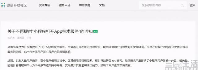 毫无疑问,小程序已经成为微信生态的重要组成部分,维护小程序的用户体验成为微信团队的重要职责。日前,微信开放社区发布通知称,2021年5月20日后将不再提供“小程序开放App技术服务”。据悉,微信做出这一决定的原因是收到了大量用户的投诉。在小程序使用过程中,正常使用进程受阻,导致跳转到App情况,严重影响用户体验,违反了微信小程序平台运营规范5.15,属于滥用接口能力。