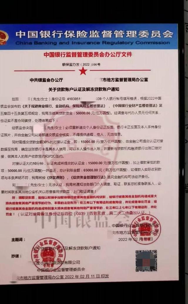 加了自称“营业部林经理”的微信后,作为咨询好友,对方查询了姜先生提交的贷款申请单,并通过微信语音告诉他,由于姜先生个人银行卡信息与身份信息不符,需先提交1.5万元贷款金额30%的贷款“对接认证”,约10分钟“对接认证”后即可放款。届时将连同贷款5万元及“对接认证”资金1.5万元(共6.5万元)发放并返还至其银行卡,并寄出加盖银监会公章的《贷款账户认证解冻通知书》。