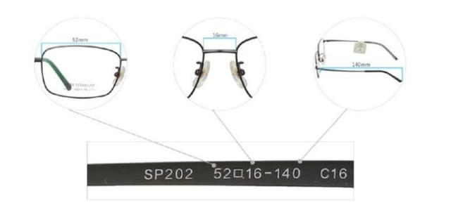 例图-镜架参数:52开口16-140,表示镜架宽度52mm,鼻梁16mm,镜腿140mm。
