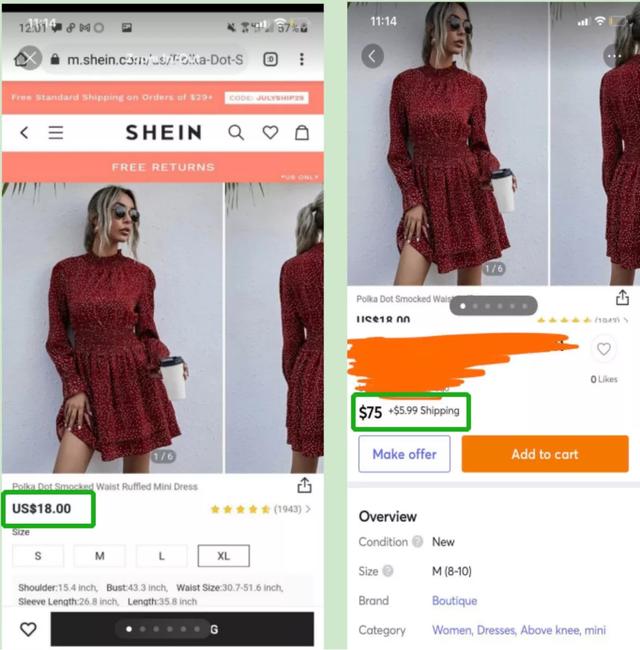 一条裙子在SHEIN上原本只卖10美元,卖家在Etsy平台转卖时标价60美元,一下子涨了6倍;只有一件首饰在SHEIN卖12美元,放在Etsy平台上,突然就变成50美元了。