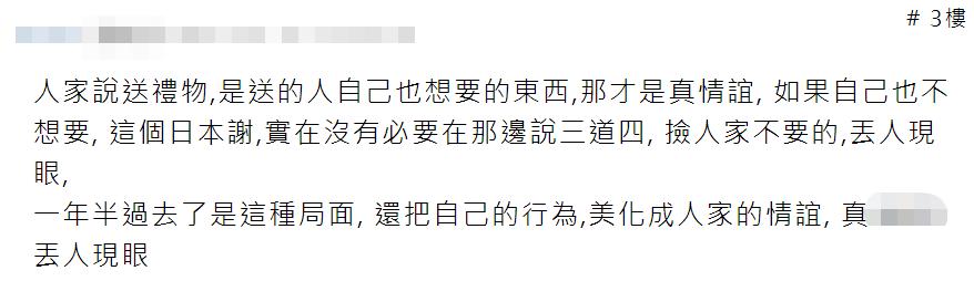 有网友说,人们都说送礼是送礼者自己想要的,那才是真正的友谊。该网友认为谢长廷在日本国内捡别人不想要的疫苗,很“尴尬”。↓