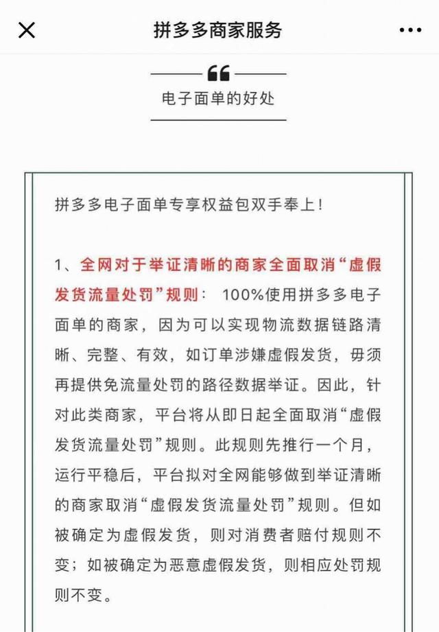 记者注意到,随后,拼多多再推一篇文章,其中《全网全面取消有明确证明的商家‘虚假发货流水罚款’规则》显示:“使用拼多多电子面单的商家,100%可以实现清晰、完整、有效的物流数据链接,如果订单涉嫌虚假发货,无需提供免流水罚款的路径数据证明。因此,对于此类商家,平台将从即日起全面取消‘虚假发货流量惩罚’规则。这一规定将先实施一个月,平稳运行后,平台拟对全网能证明清楚的商家取消‘虚假发货流量惩罚’的规定。但如果确定为虚假发货,对消费者的赔偿规则不变;如果认定为恶意虚假交付,相应的处罚规则不变。”
