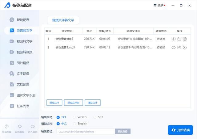 软件支持上传mp3、ma4、wma、aac、flac等格式文件进行转换,也支持批量转换。可以一次上传多个文件进行转换,转换速度快,准确率高!!!