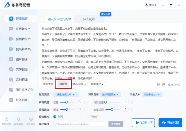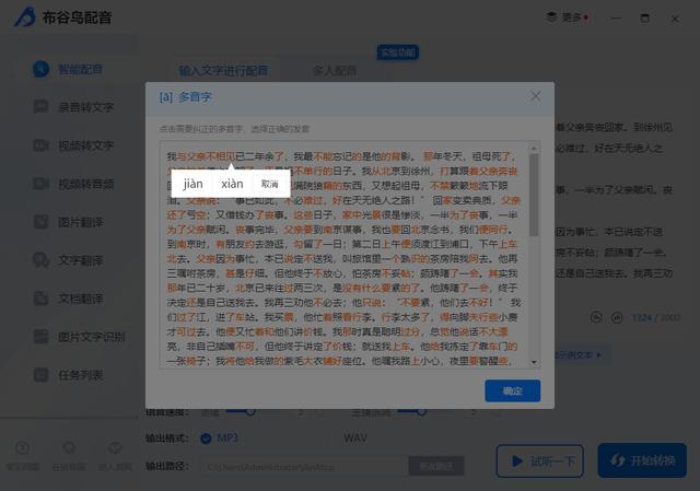 如果我们的文案中有多音字,不用担心发音错误。软件支持多音字标注,副本中的所有多音字都会被标注,我们只需要选择正确的发音即可。