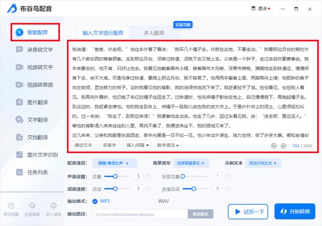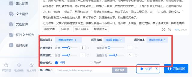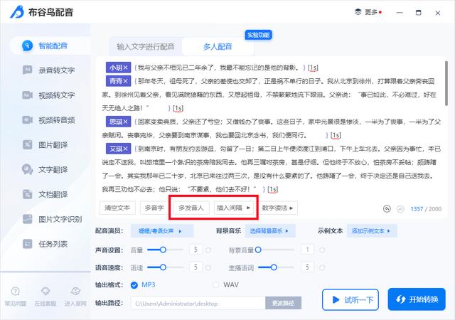 (2)选择【配音员】,设置音量、语速、语调,点击【开始转换】,快速将文字转换成音频。