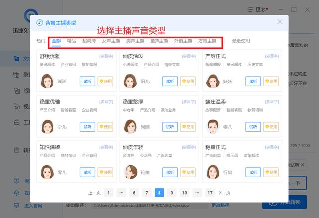 2.可以选择的主播类型有上百种,分类也很明确。比如女主播、男主播、儿童主播、方言主播等。可以随意挑选。选择完成后,点击试听自定义声音和语速。