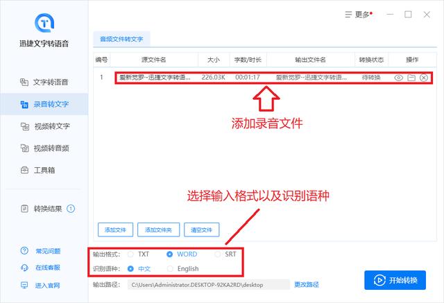 录音转文字功能也很容易操作。首先点击“录音转文字”功能,添加要转换的录音文件(注意:支持. mp3,。WMA。AAC和其他格式)。最后,选择识别的语言和输出格式,点击“开始转换”。