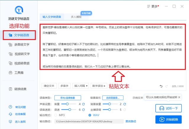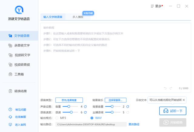 这个软件的名字叫-快速文语转换,功能非常丰富。支持文字转语音(多人广播)、录音转文字、视频转文字、视频转音频等功能。转换效果也很好,声音堪比真人。