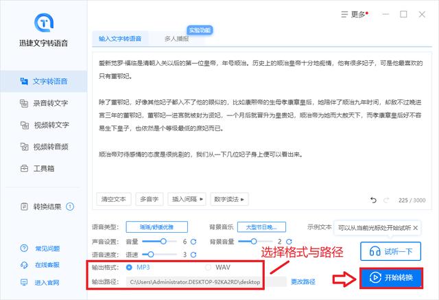 3.调整语速和音量后,您可以选择输出格式,如MP3和WAV。选择输出格式和输出路径后,点击开始更改。