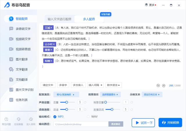 只要先设置好不同音箱的对应线路,就可以得到一个多声部的音频文件。我们还可以设置声音的音量、速度、语调,转换后直接输出常用的MP3格式。
