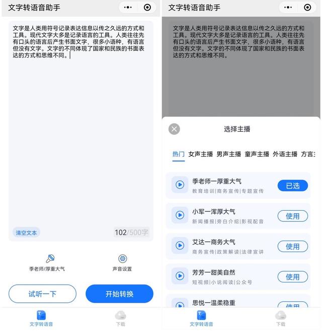操作很简单。打开软件,在首页找到“文字转语音”功能,直接复制粘贴文字,选择想要的音色,调节声音大小,一次可以转换一万个单词。