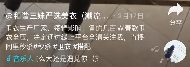 在Tik Tok正式直播之前,“和谐三姐妹美妆”的Tik Tok粉丝只有400人,每个视频播放几百。2月27日,他们发布了一个关于衣服盘点的视频,文案告诉观众“今天你喜欢的都有了”,获700赞,播放量超过30万。同一天,三妹在Tik Tok开始了第一场直播。这个30万播放量的视频,从直播间引流了近5000人。
