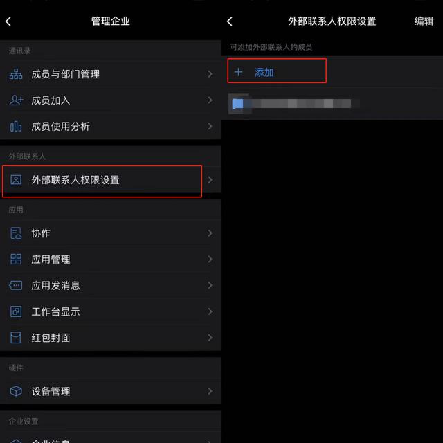 此时,员工需要联系管理员,要求管理员在手机企业微信[工作台]-[管理企业]-[外部联系人权限设置]中将员工设置为可以添加外部联系人的会员。
