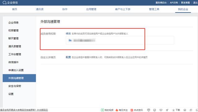 或者让管理员登录企业微信管理后台,在后台【我的企业】-【对外沟通管理】中打开员工的对外联系权限。