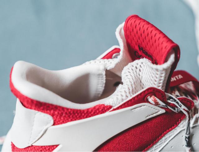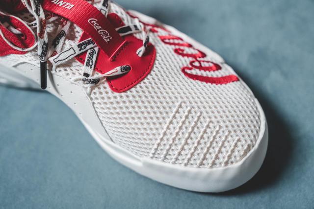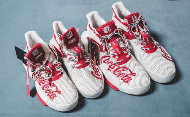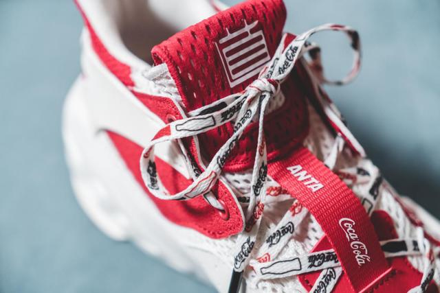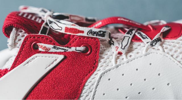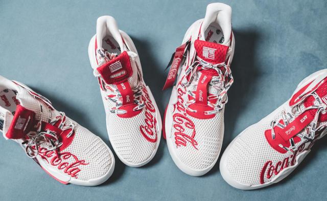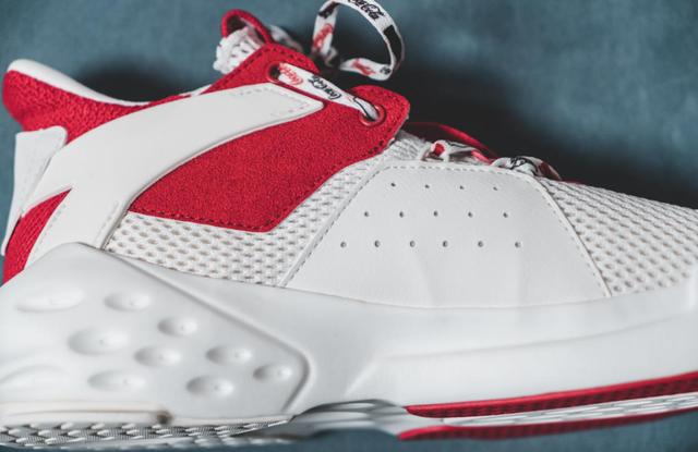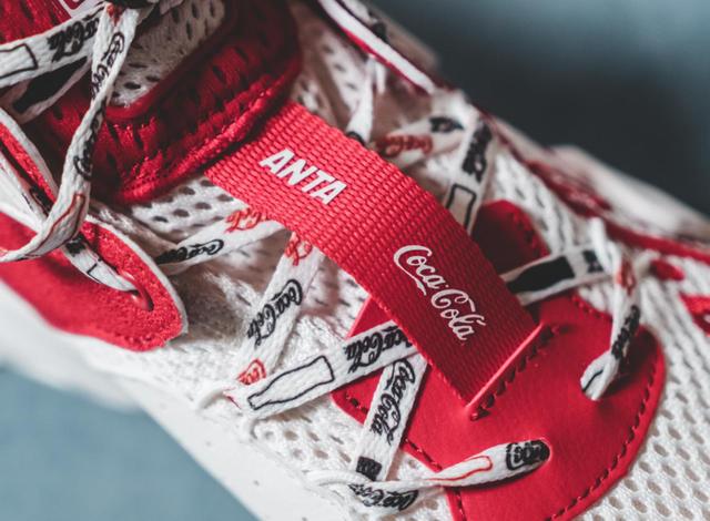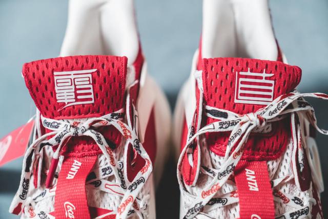 固定鞋带的方式不一样。红色的皮衣上套着红色的辫子,展现出安踏和可口可乐的元素,再用红白鞋面材料缝制,外层用皮草固定。