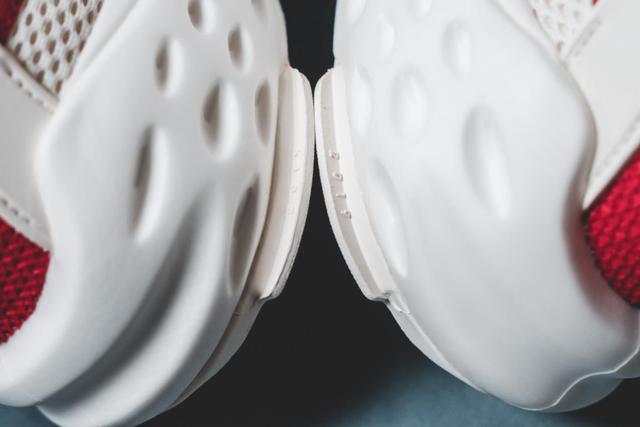 鞋跟周围有一大圈软胶,有一定的固定作用,但跑步打球感觉不稳,也最适合压路。后跟用红色编织网包裹,再用硅胶包裹,硅胶外面是一层白色的软皮。
