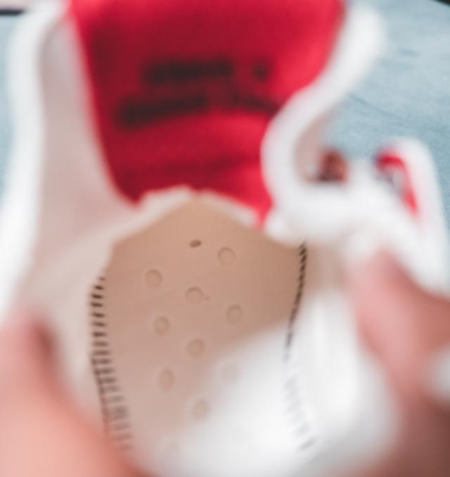 如果没有参考,看男女款都差不多。先说男款。我们可以看到内弯比较明显,女款可能因为比较小,所以不会有那么大的弧度。是整个红白相间的颜色,让人想起小时候的红白机,但是只要仔细看,这种白色并不是纯白,略带米色。