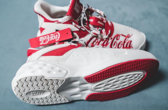 鞋面前端是梭织材质,刚好适合夏天穿,不会太热。拇指部分用横线缝制,不规则,凸显个性。另一面,用醒目的红线缝上了可口可乐的logo。