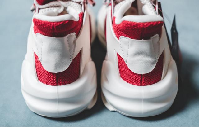 从侧面能看出用了多少材料吗?鞋底是软橡胶,上面有红织料和白织料,编织工艺也不一样。白色的气孔是皮质的,上面的红色是皮草,然后鞋跟后面的硅胶材质和鞋跟的皮质材质一直在变。从上面可以看到,内衬采用了不同的白色材质,不仅颜色拼接非常出色,而且每种材质都完全不同。它们确实是精心设计的产品。