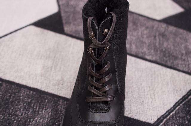 略粗的扁平打蜡鞋带和顶部两个快速系紧的孔眼表明这是一双休闲靴。