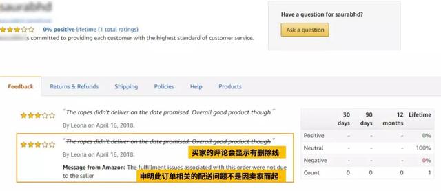 比如你通过“购发货”按时发货,并提供了跟踪信息,但买家提交了差评,内容仅涉及包裹延迟或未送达,你可以请求审核反馈。如果通过,负面反馈不会影响你订单的不良率,买家评论会出现删除线和以下声明:与此订单相关的配送问题不是卖家造成的。