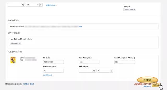 3.点击【购买配送】按钮,亚马逊不收取运费,卖家直接与物流商结算。