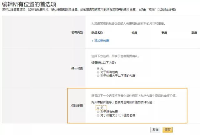 设置您通常的包装尺寸,在[保险设置]中选择“无”,然后保存。