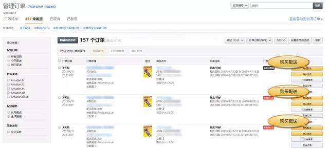 1)选择每个订单上的“购买发货”按钮,为订单购买发货标签。