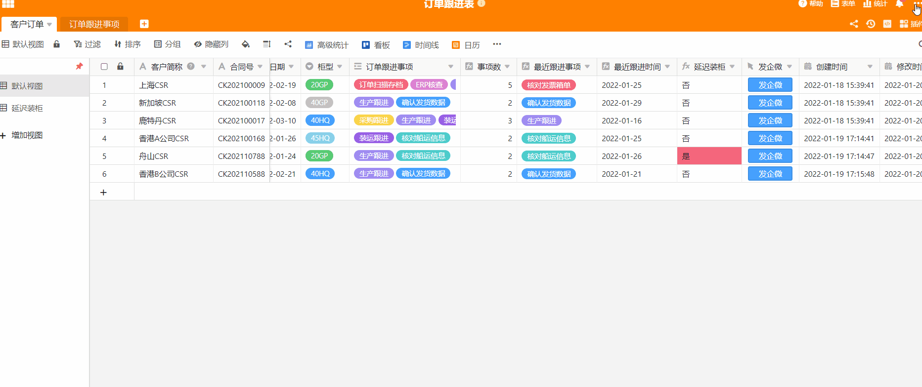 在商品销售过程中,除了使用专门的ERP系统外,如何用表格清晰地记录和管理订单的后续项目等零散信息?比如记录订单生产跟进,是否确认发货数据,是否查看出货信息等。,甚至自动预警发送从小跟进物品到装车日期的所有订单,更进一步,可以实时查看不同数据的分析和可视化。使用座椅非常方便。作为一款新型的协同表格和信息管理工具,其丰富易用的功能给了我很好的帮助。