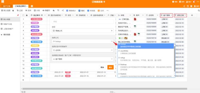 在完成链接子表记录的基础上,还可以使用“链接公式”快速实现跨表查找、引用和跨表计算。例如,在“链接公式”中选择查找,将“客户订单”表中每份合同的客户缩写和包装日期引用到“订单跟进事项”表中,从而避免重复填写。如下图: