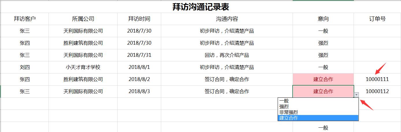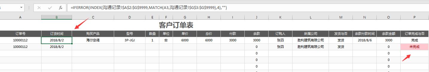 在这里输入客户在沟通记录中确认的订单号,会弹出订货时间、订货人、订货公司。条件格式变色差异显示不完整。