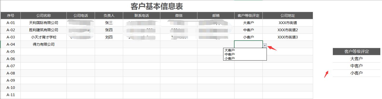 在客户基本信息表中输入客户相关信息,旁边的小窗格是下拉菜单。