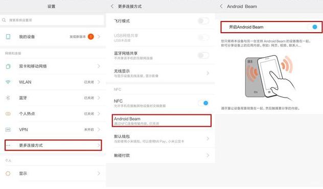 我们可以打开手机设置,然后找到更多的连接选项,点击Android Beam选项,最后就可以打开Android Beam了!